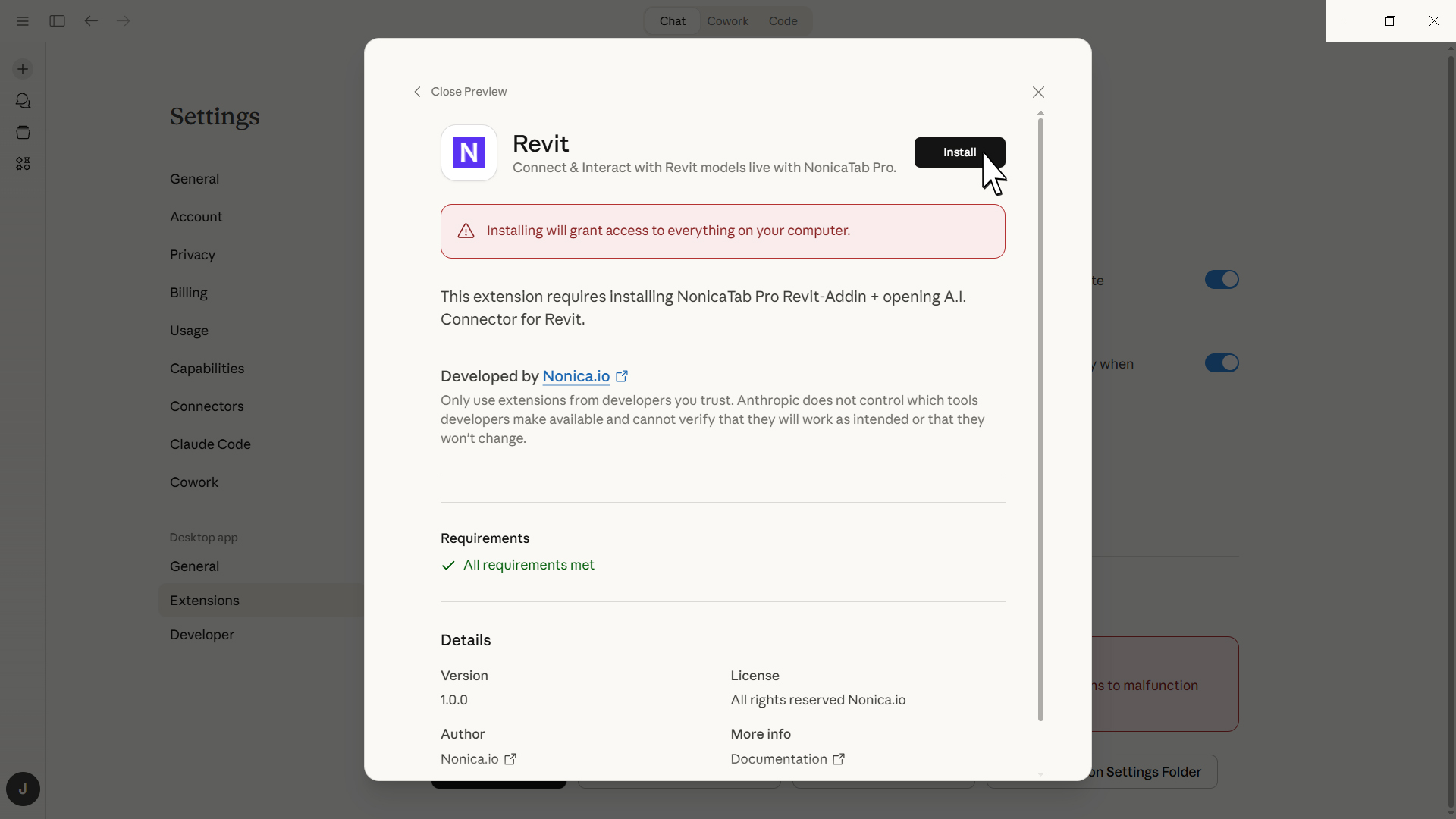 - Select the Extension file (mcpb) according to your version of Nonicatab and click on Install.